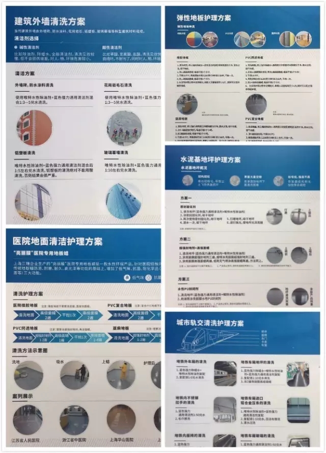 企业专注于专业市场的开发,推出了弹性地板护理、水泥基地坪护理、建筑外墙清洗方案、医院地面清洁护理、城市轨交清洗护理等5大清洁护理方案。