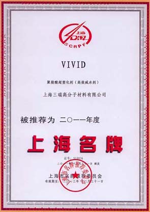 VIVID聚羧酸超塑化剂获评2011年度“上海名牌”产品称号