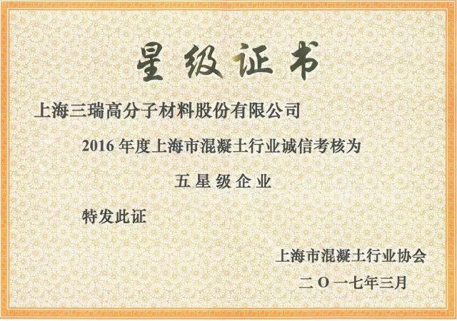 为了加强与提高上海混凝土企业产品和服务质量,上海市混凝土行业协会组织开展了二0一六年度上海市混凝土行业“诚信杯”评审活动。经过评委会工作小组现场考核和综合评审,12家预拌混凝土企业、预制混凝土企业、干混砂浆企业、混凝土外加剂企业,获得二0一六年度上海市混凝土行业“诚信杯”五星级企业荣誉称号。三瑞高材从参与本次考评的百家外加剂企业中脱颖而出,荣获上海市混凝土行业 “诚信杯”五星级混凝土外加剂企业。
