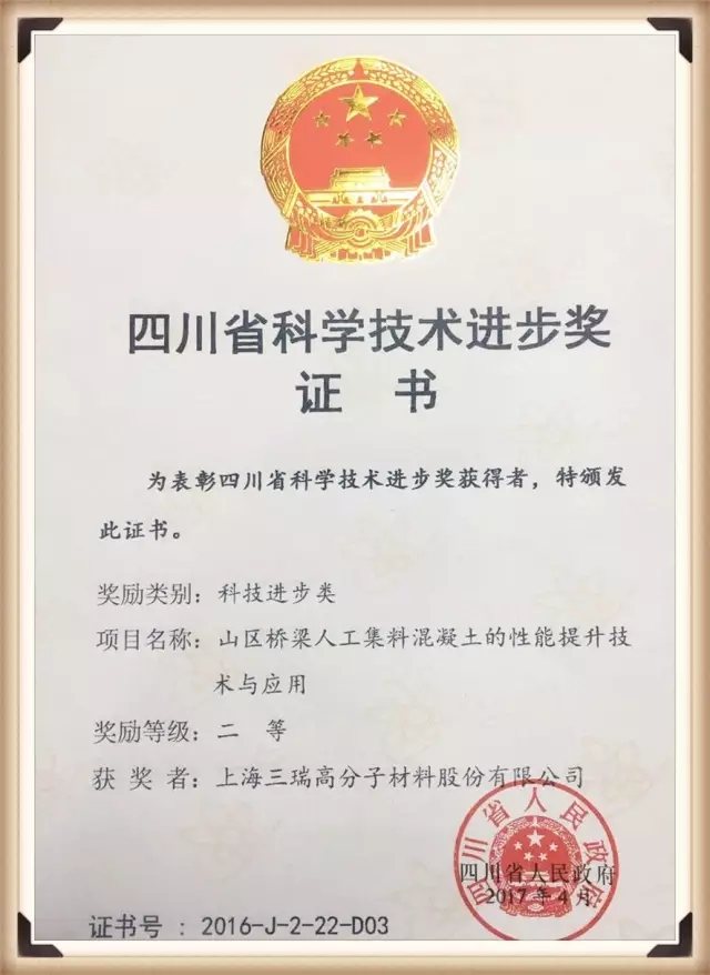 三瑞高材与四川省交通运输厅公路规划勘察设计研究院桥梁分院共同承担的四川省级科技计划项目《山区桥梁人工集料混凝土的性能提升技术与应用》获评“四川省科学技术进步奖二等奖”。