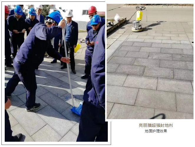 培训结束后,项目部安排在室外毛石地面现场演示了使用亮丽膜超强封地剂的地面护理效果,学员们纷纷表示受益匪浅!