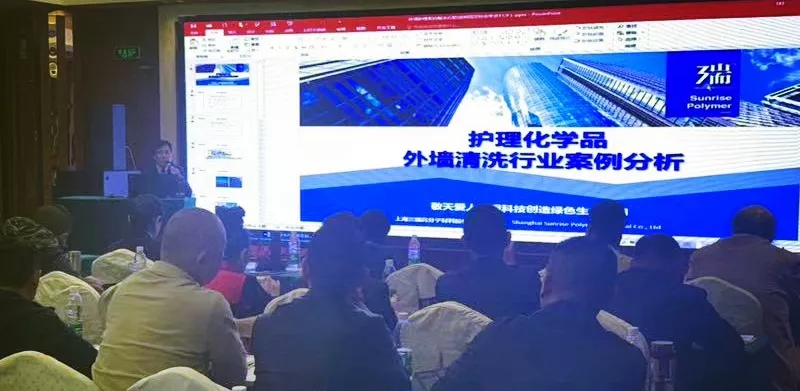 作为中国职业安全健康协会高空服务业分会的会员,来自三瑞高材护理化学品部的杨健经理在年会现场分享了外墙清洗技术及案例分析,受到会员的广泛关注和热烈反响!