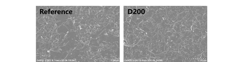 瑞固新能(上海)材料科技有限公司在分散剂的结构设计、合成与开发方面具有丰富的经验与技术的积累,针对于水性体系分散CNTs开发出LIB-D200分散剂,在多家CNTs和石墨烯浆料生产厂家得以应用。相对于传统分散剂,LIB-D200是一类高性能润湿分散剂,具有独特的亲碳材料的基团,易吸附在碳材料表面,能够形成稳定的空间位阻排斥力,避免颗粒聚集,能够显著降低浆料粘度,提高浆料固含量,能够显著改善浆料的稳定性,储存过程中不易发生沉降,缓解浆料增稠现象,适用于水性体系对各类碳材料的分散,特别推荐用于难分散的碳纳米管和石墨烯体系。