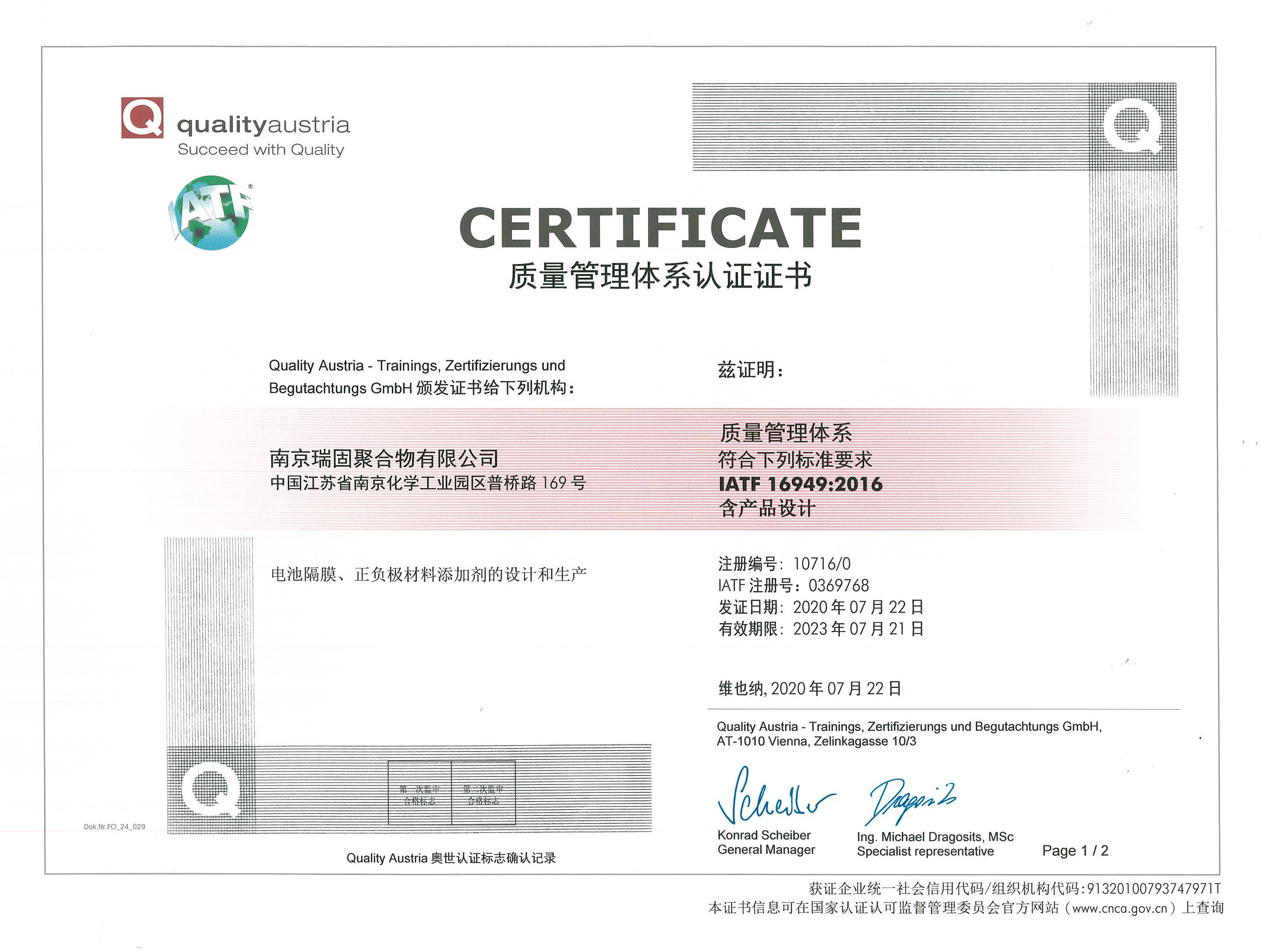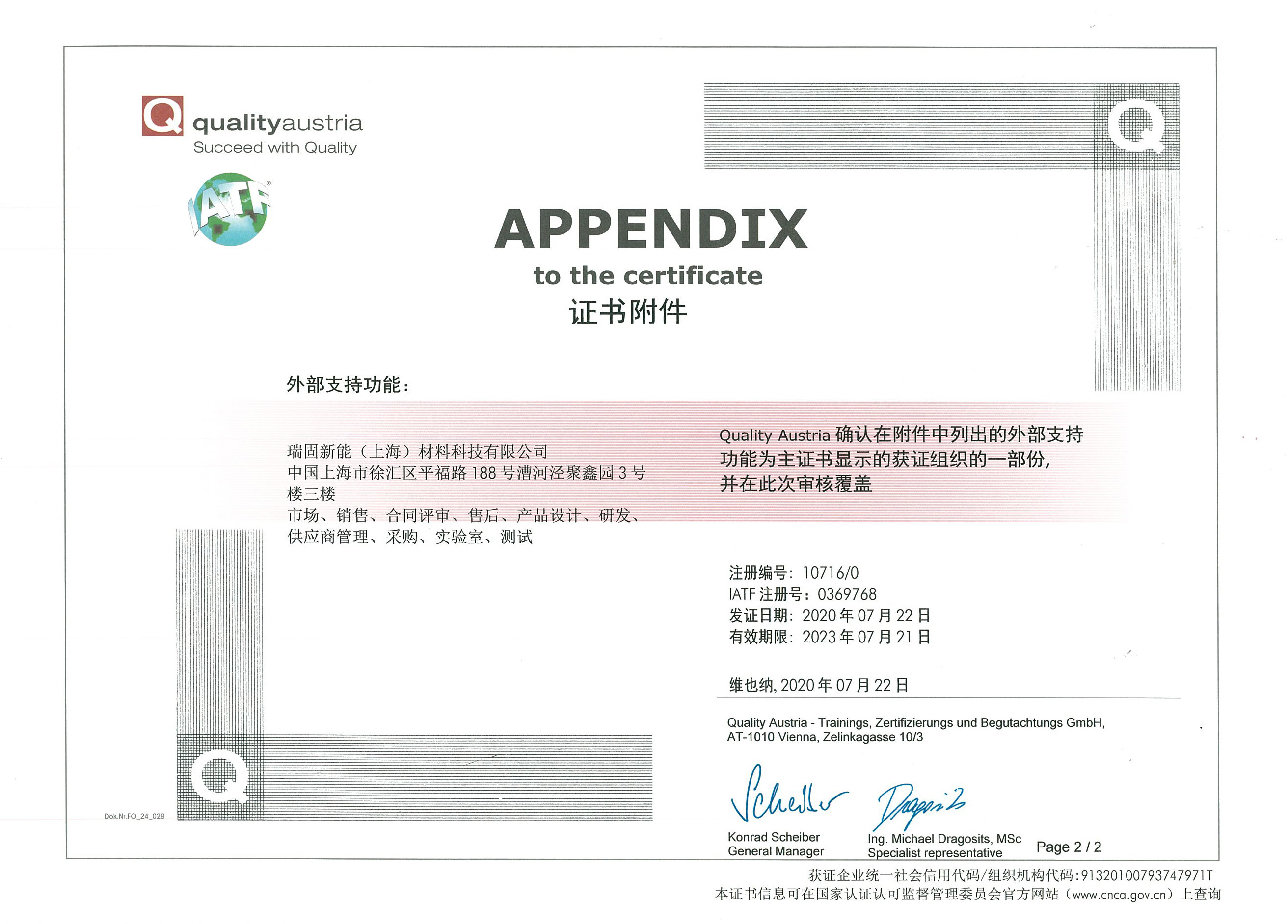 2020年7月22日,瑞固新能(上海)材料科技有限公司顺利通过了IATF16949:2016质量体系认证,此次认证的通过,不仅是对公司质量管理工作的认可,也标志着公司获得了进入电池隔膜、正负极材料添加剂市场的“绿色通行证”,为公司积极开拓汽车行业市场奠定了坚实的基础,提高了公司的综合市场竞争力。