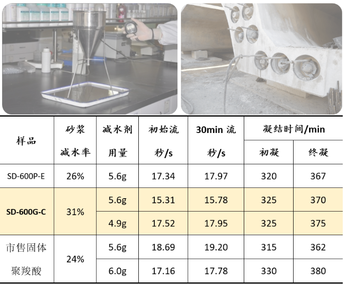 SD-600G-C已正式面向市场销售,经实验室试验评价和部分客户应用反馈可替代传统喷雾干燥的固体羧酸减水剂,应用于孔道压浆料和灌浆料产品中,流动性好、不泌水、不分层,压浆/灌浆饱满早强、微膨胀。