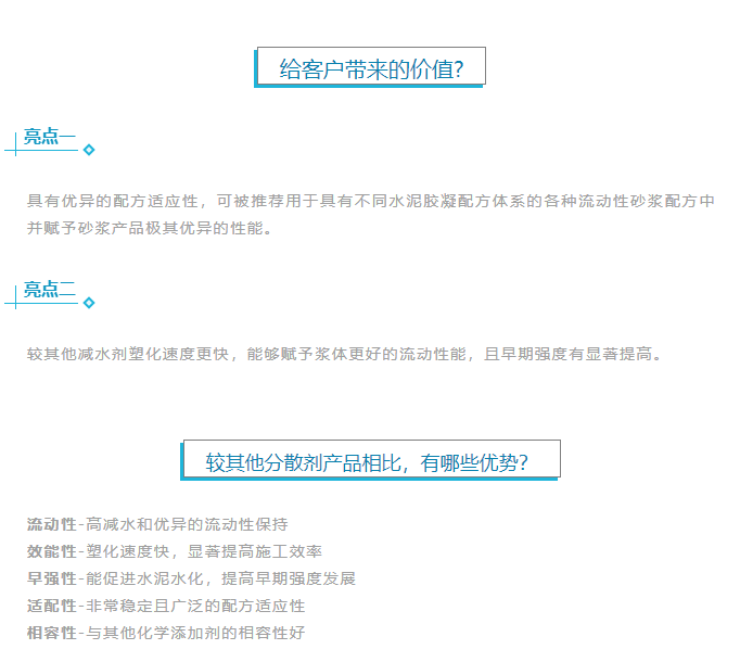 白色至粉红色水溶性粉末,具有优异的分散性能和材料适应性,能显著改善水泥基材的流动性和铺摊性,赋予材料较高的早期强度。本产品能广泛应用于砂浆体系中,如高端面层自流平砂浆,早强型砂浆及超早强灌浆材料和修补砂浆等,可显著提高砂浆流动性,并有利于材料的早期强度发展,提高施工效率。