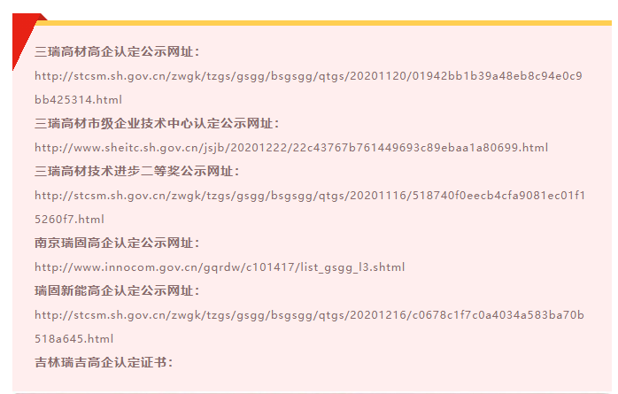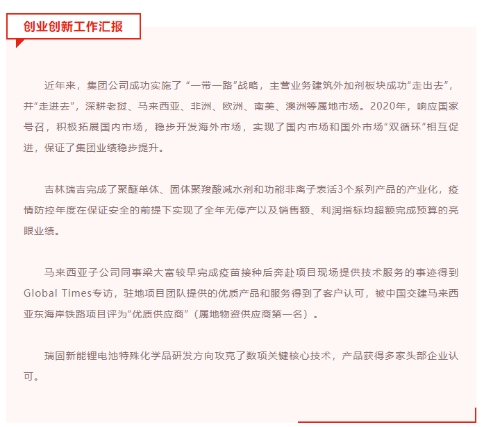 2020年,三瑞集团创业创新工作再创佳绩。母公司上海三瑞高分子材料股份有限公司(简称“三瑞高材”)通过了高新技术企业复审,获得了上海市科技进步二等奖并被认定为上海市企业技术中心,子公司南京瑞固聚合物有限公司、吉林瑞吉特殊化学品有限公司和瑞固新能(上海)材料科技有限公司均获得国家高新技术企业认定。