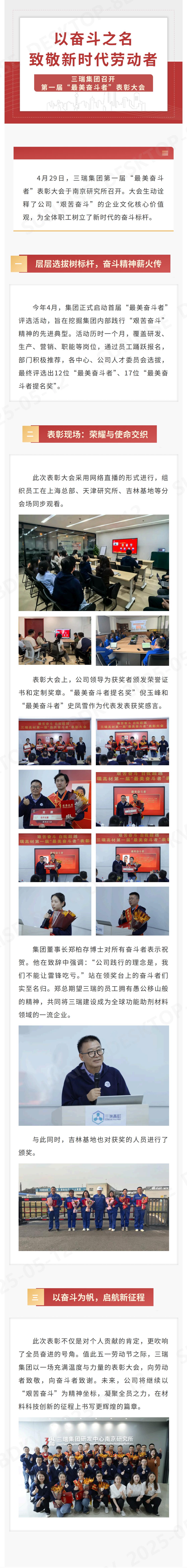 以奋斗之名,致敬新时代劳动者 2025/5/1 16:51:07 4月29日,三瑞集团第一届“最美奋斗者”表彰大会于南京研究所召开。大会生动诠释了公司“艰苦奋斗”的企业文化核心价值观,为全体职工树立了新时代的奋斗标杆。